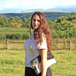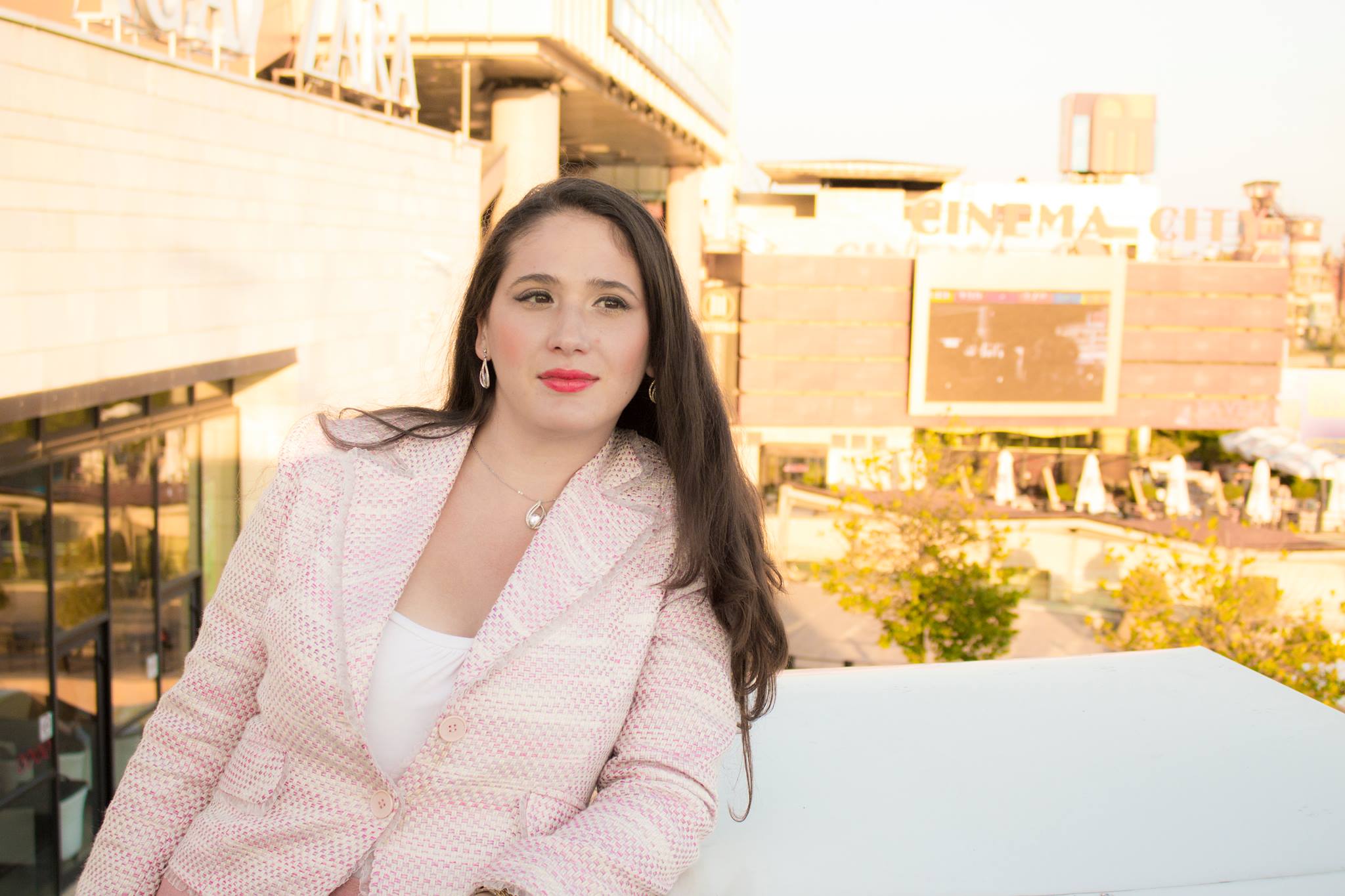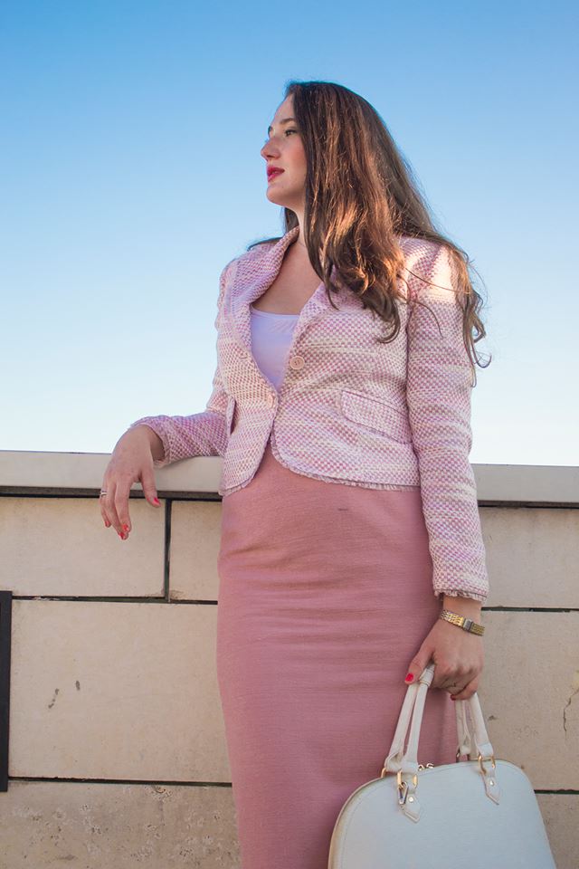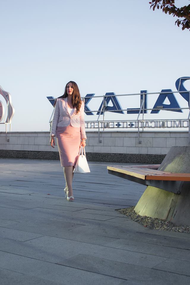 Un dress code office trebuie abordat cu decenta si bun—gust, iar pentru aceasta tinuta am ales piese cu o linie clasica si feminina.In general nu este ok la birou sa ne imbracam in culori tipatoare sau prea colorat, dar daca ne pigmentam tinuta office cu exact cata culoare trebuie, putem obtine o tinuta chic. Rozul indiferent de nuanta creeaza o stare benefica de optimism si buna dispozitie. Imi place sa combin piesele cu imprimeu cu piese monocrome. Astfel am combinat clasicul sacou cu o fusta midi si un top modern si simplu. Fustele midi sunt rafinate si feminine si se potrivesc in aproape orice imprejurare. Am acesorizat tinuta discret, iar de aceasta data am asortat poseta cu pantofii.